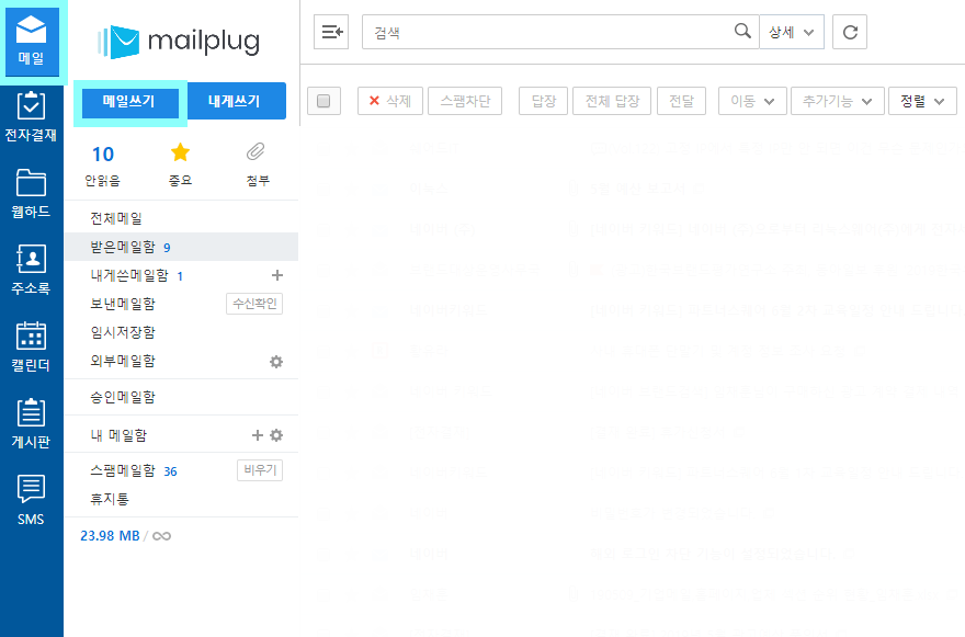 STEP 01_ 먼저 메일플러그 웹메일에 로그인한 뒤 [메일] 탭에 [메일쓰기] 로 진입합니다.