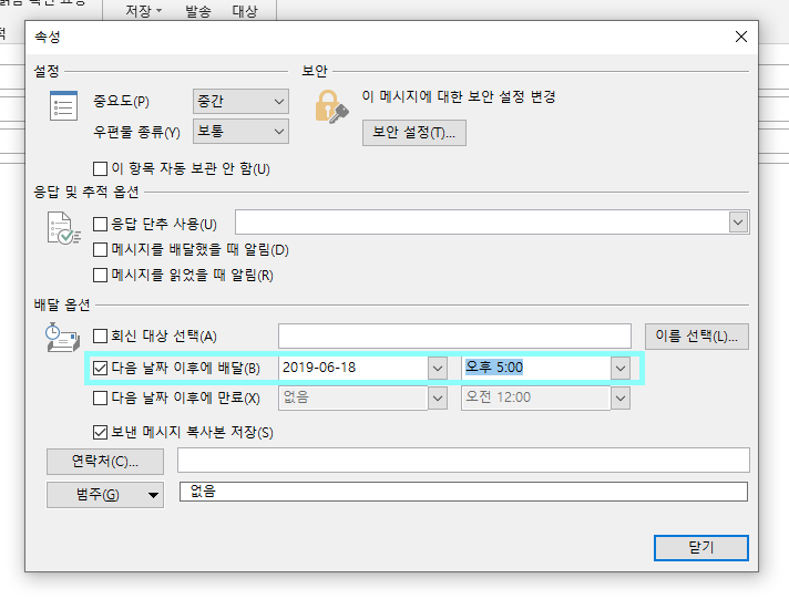 단, 설정해 둔 날짜 및 시간에 아웃룩이 활성화 돼있어야 정상적으로 발송됩니다.