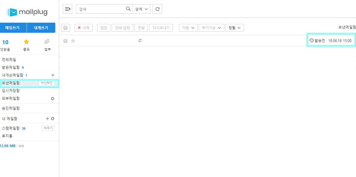 STEP 05_ [보낸메일함]에서 해당 메일이 ‘발송전’으로 뜨고 기타 설정값이 맞게 세팅됐는지 확인하면 메일플러그로 예약 발송하기 완료입니다.