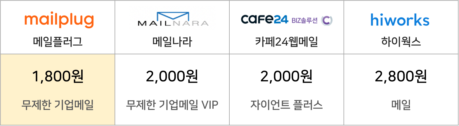 앞서 표에서도 보셨듯이, 메일플러그는 국내 최저가에 무제한 용량 기업메일 서비스를 제공하는데요.