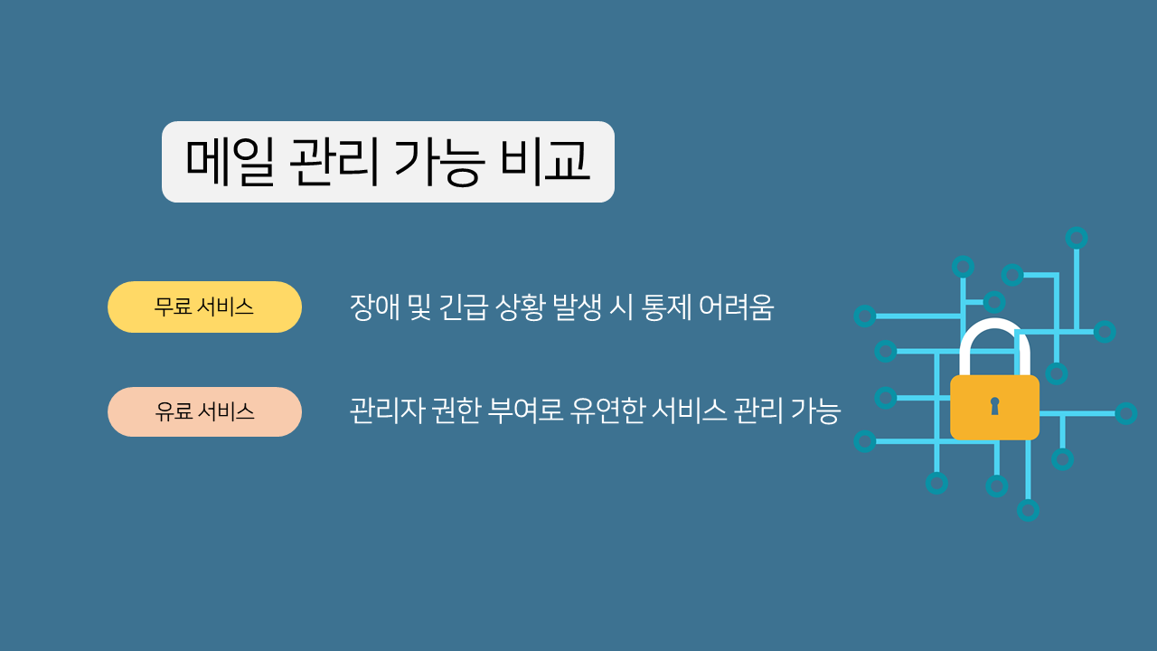 반면 유료 기업용메일은 기업이 메일 데이터베이스를 소유하기 때문에 관리자 계정을 이용할 수 있습니다.