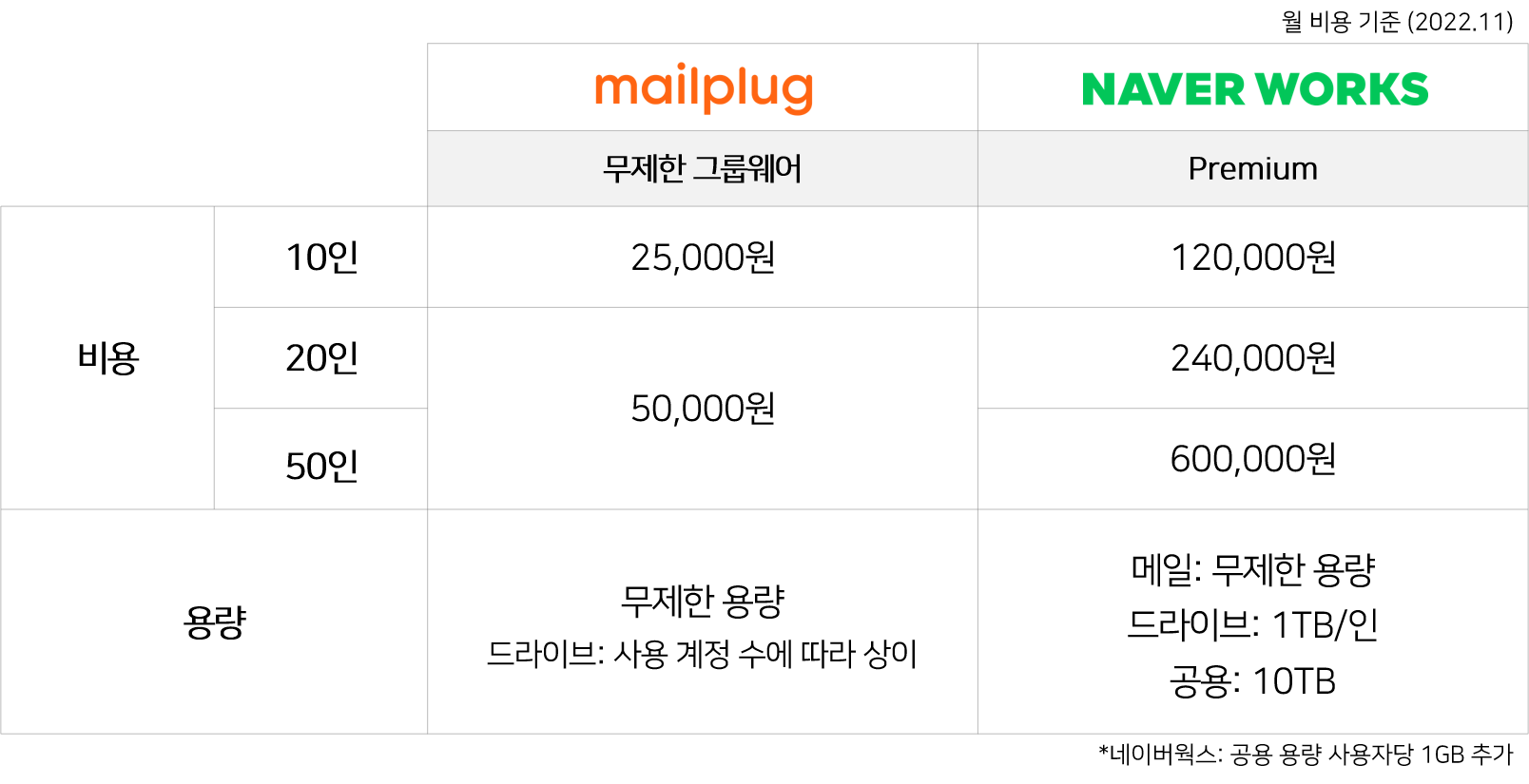 기업메일의 용량을 무제한으로 제공하는 상품을 기준으로 비교해보겠습니다.