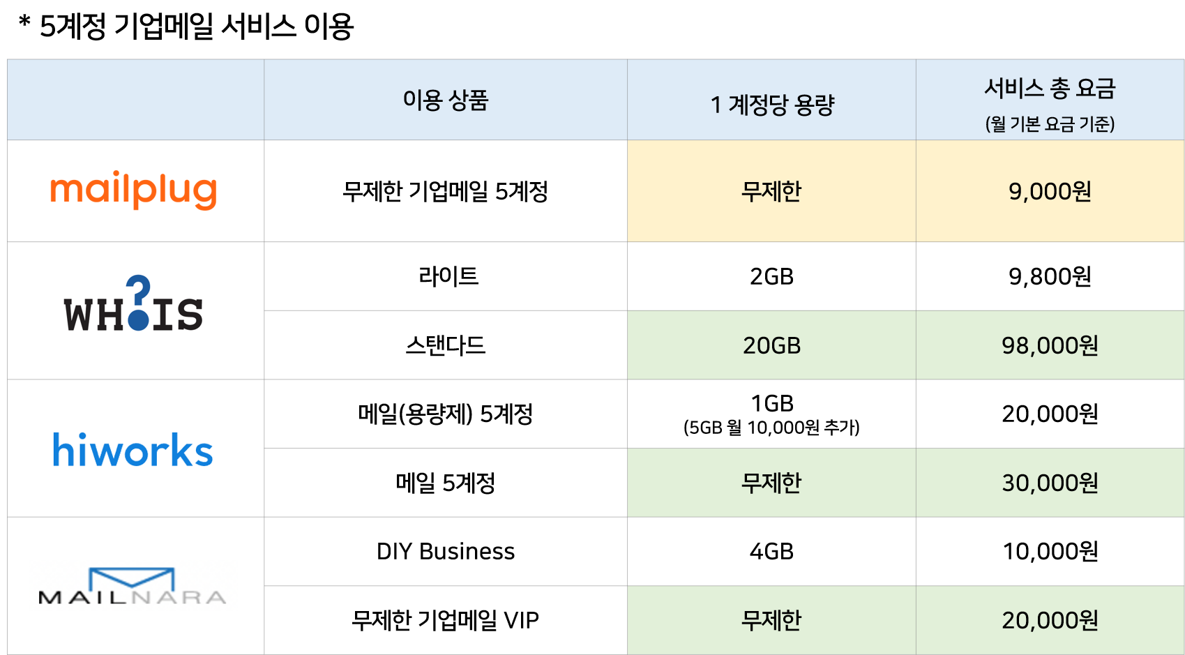 좀 더 쉽게 살펴보기 위해 주요 기업용 웹메일 업체의 가격을 확인해 보았는데요.