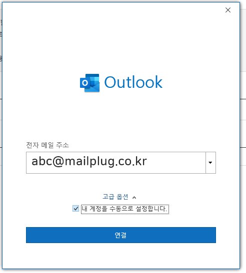 고급 옵션 > 내 계정을 수동으로 설정합니다.에 체크해주세요.