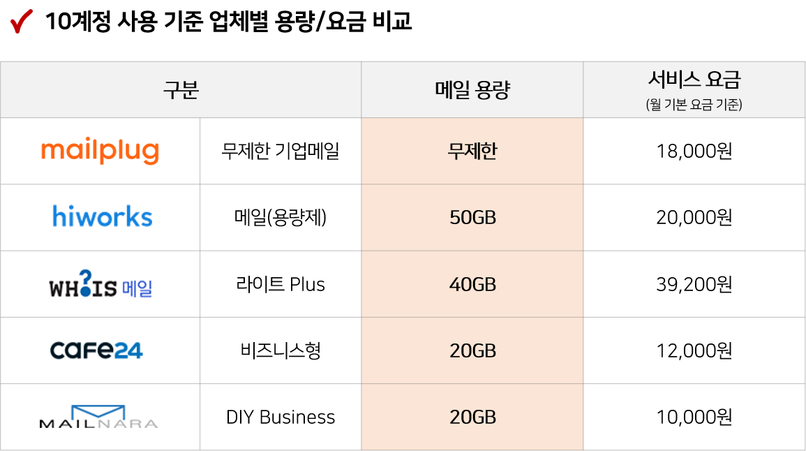 한 번 기업메일 업체 5곳의 용량과 요금을 살펴보았는데요.
