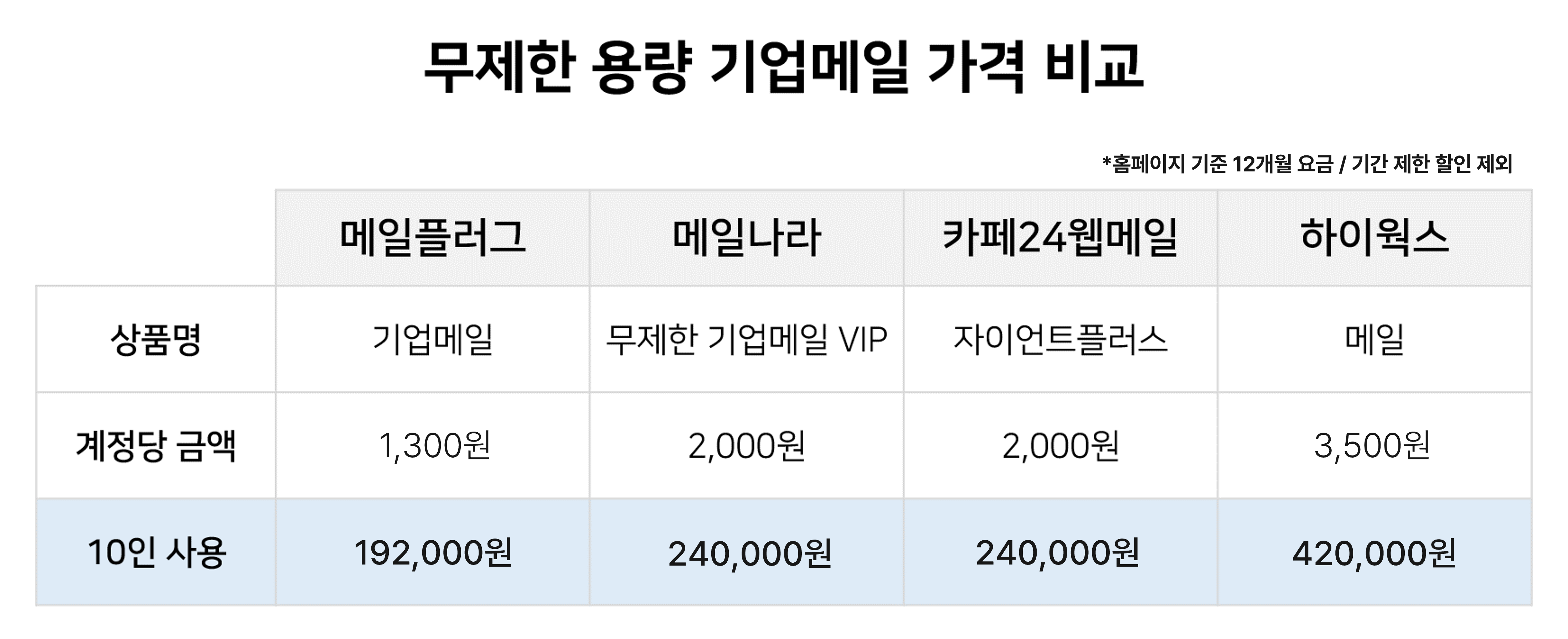 무제한 기업메일의 가격부터 살펴보겠습니다.