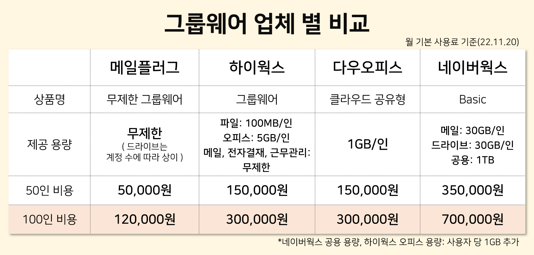 메일플러그의 무제한 그룹웨어가 가장 합리적인데요.
