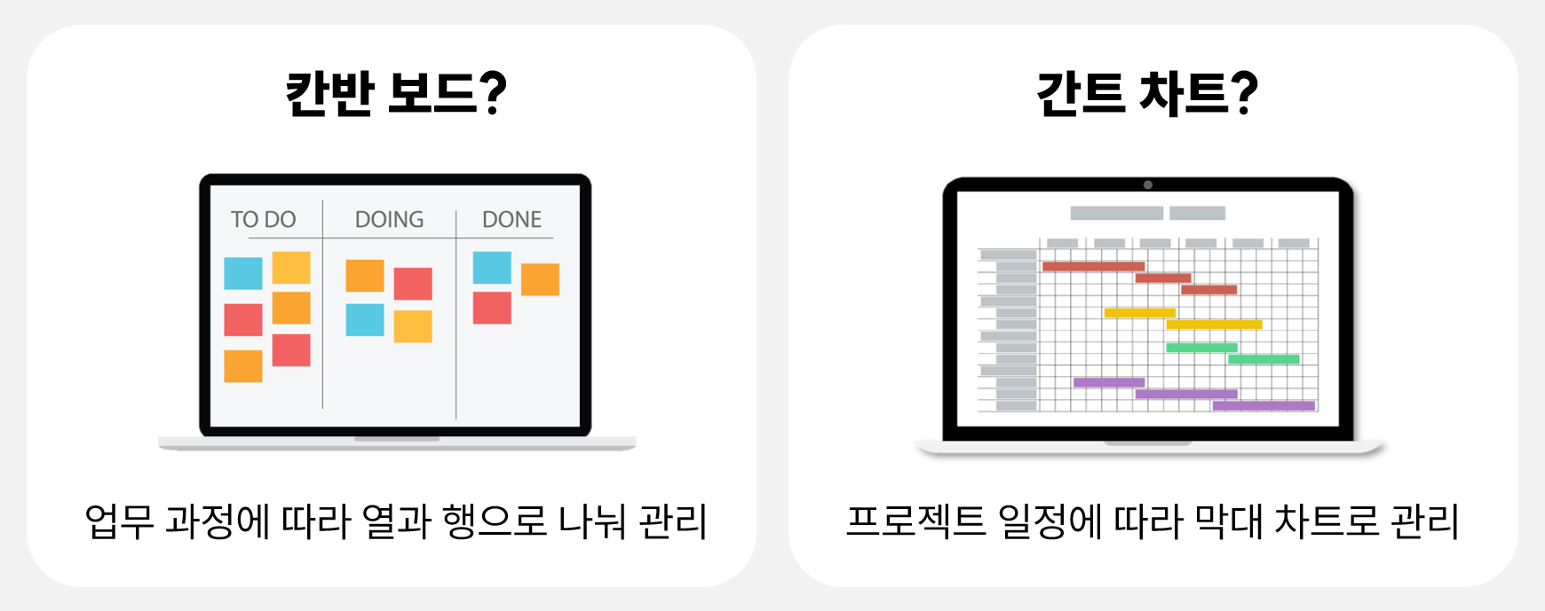 보기 형식은 칸반보드와 간트차트로 서로 다르죠.