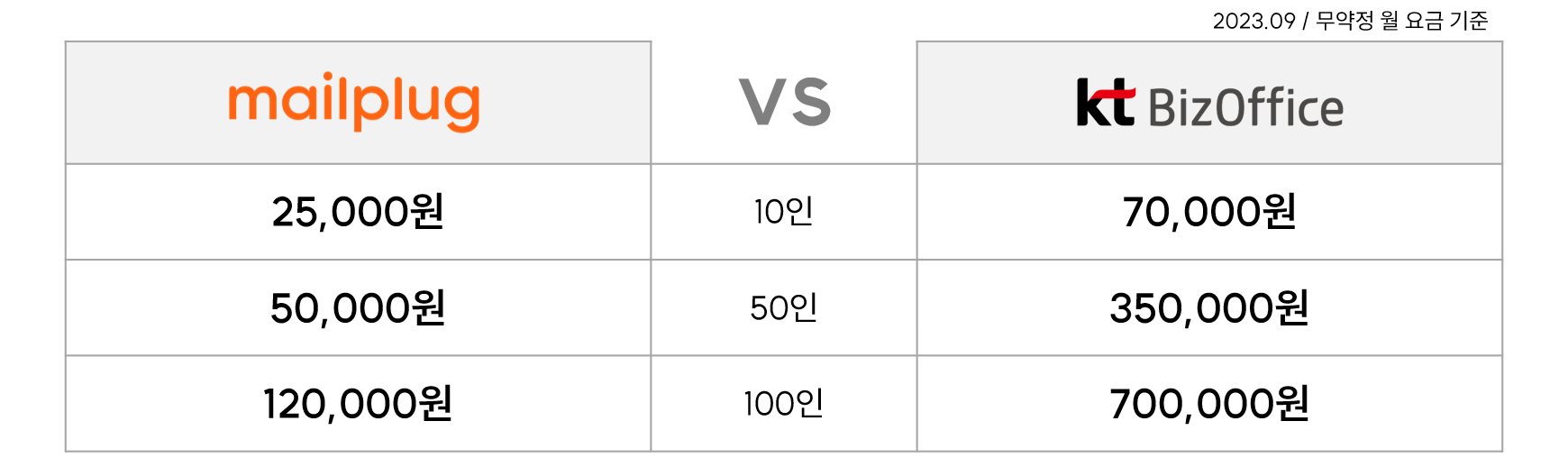 50인은 메일플러그 5만원 / KT 비즈오피스 35만원인데요.