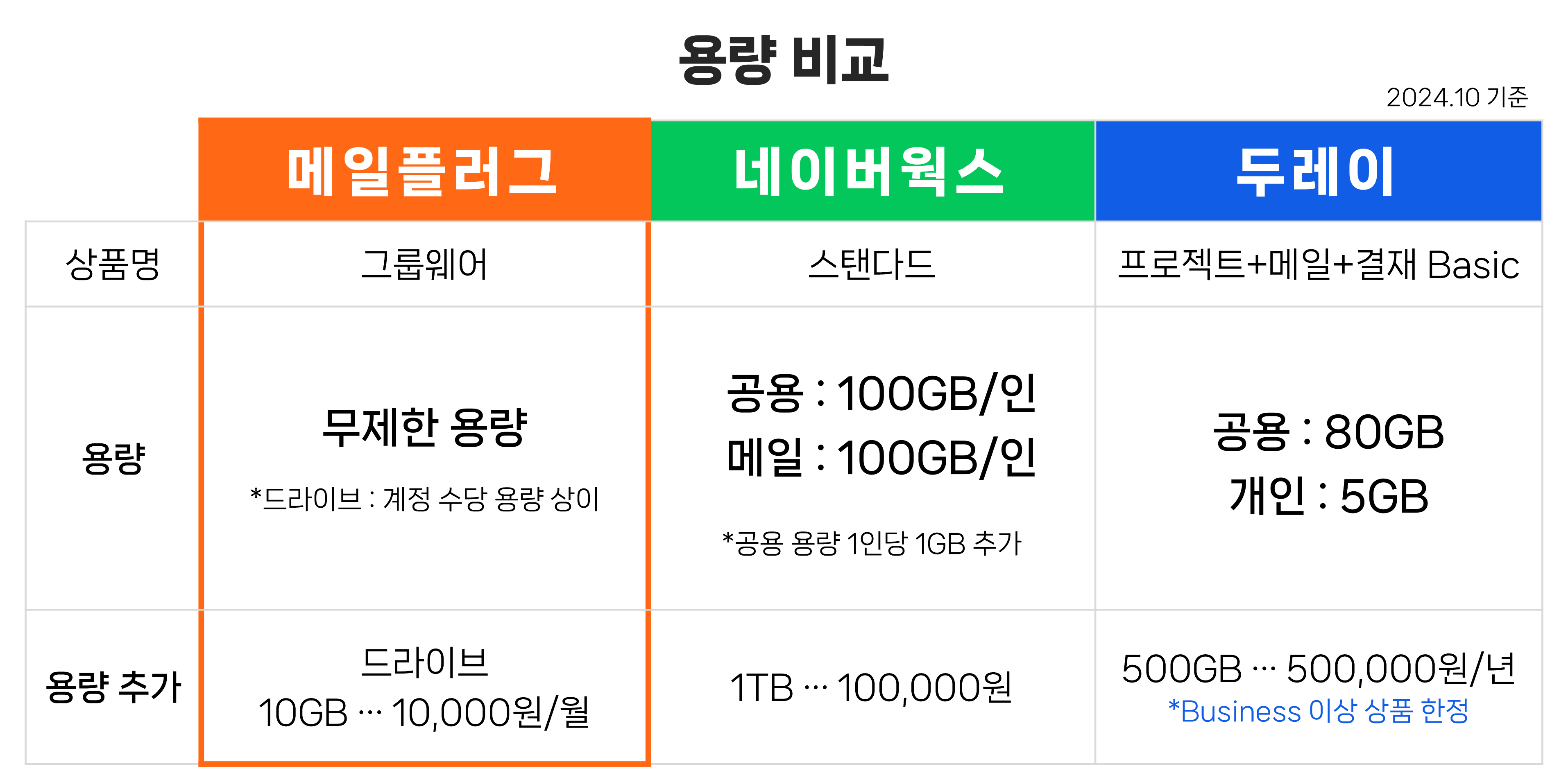 네이버웍스랑 두레이는 용량이 한정되어 있습니다.
