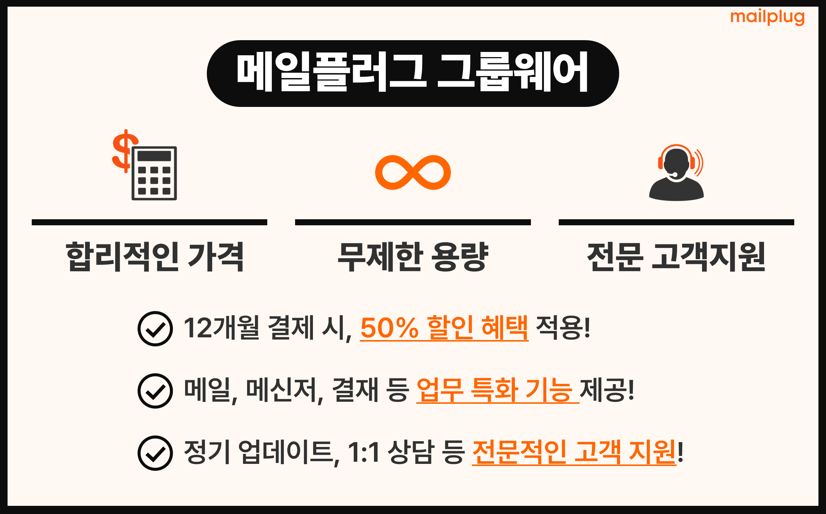 따라서 합리적인 그룹웨어를 원한다면 메일플러그가 가장 적합하겠죠?