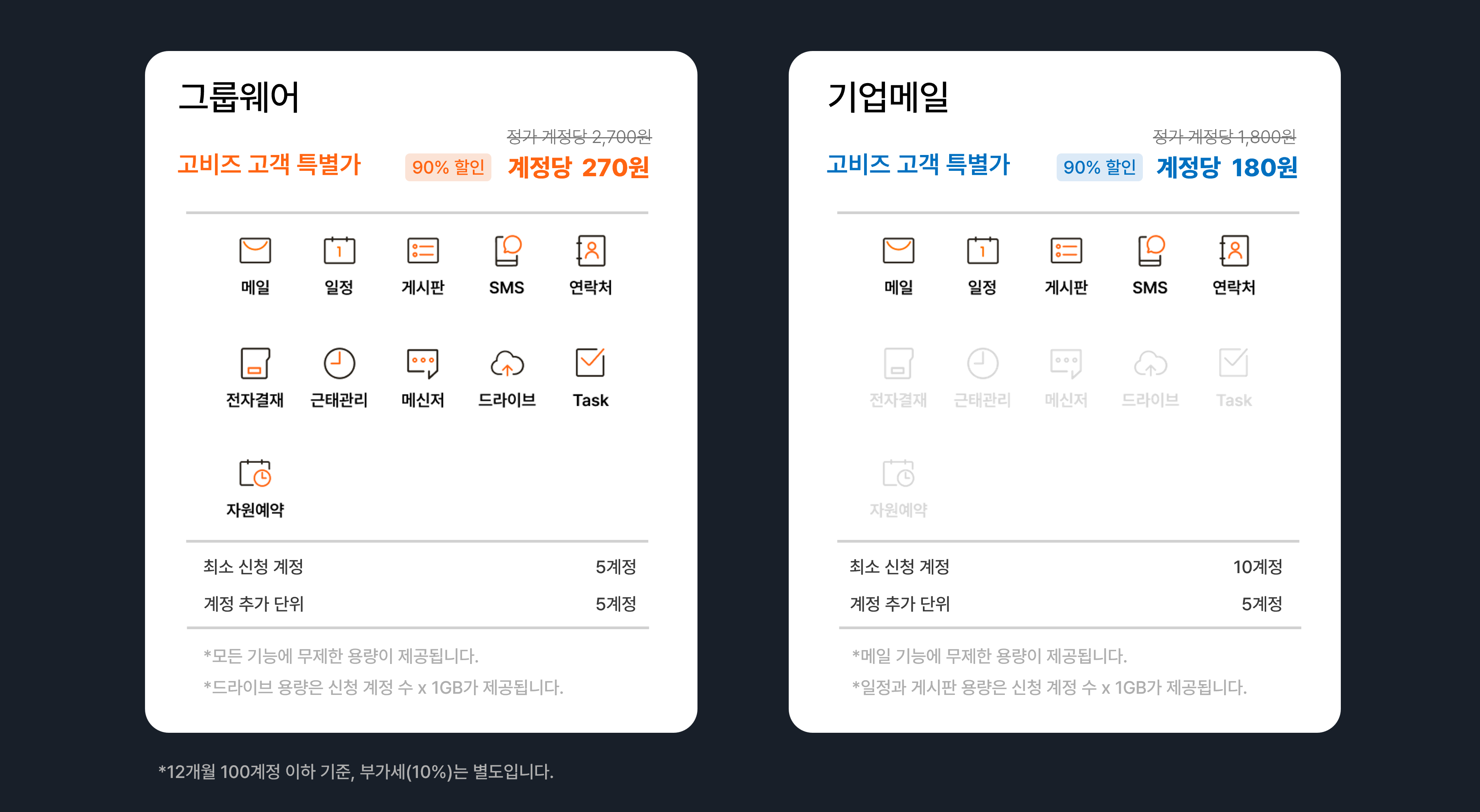 기업메일은 계정당 180원에 도입 가능 합니다.