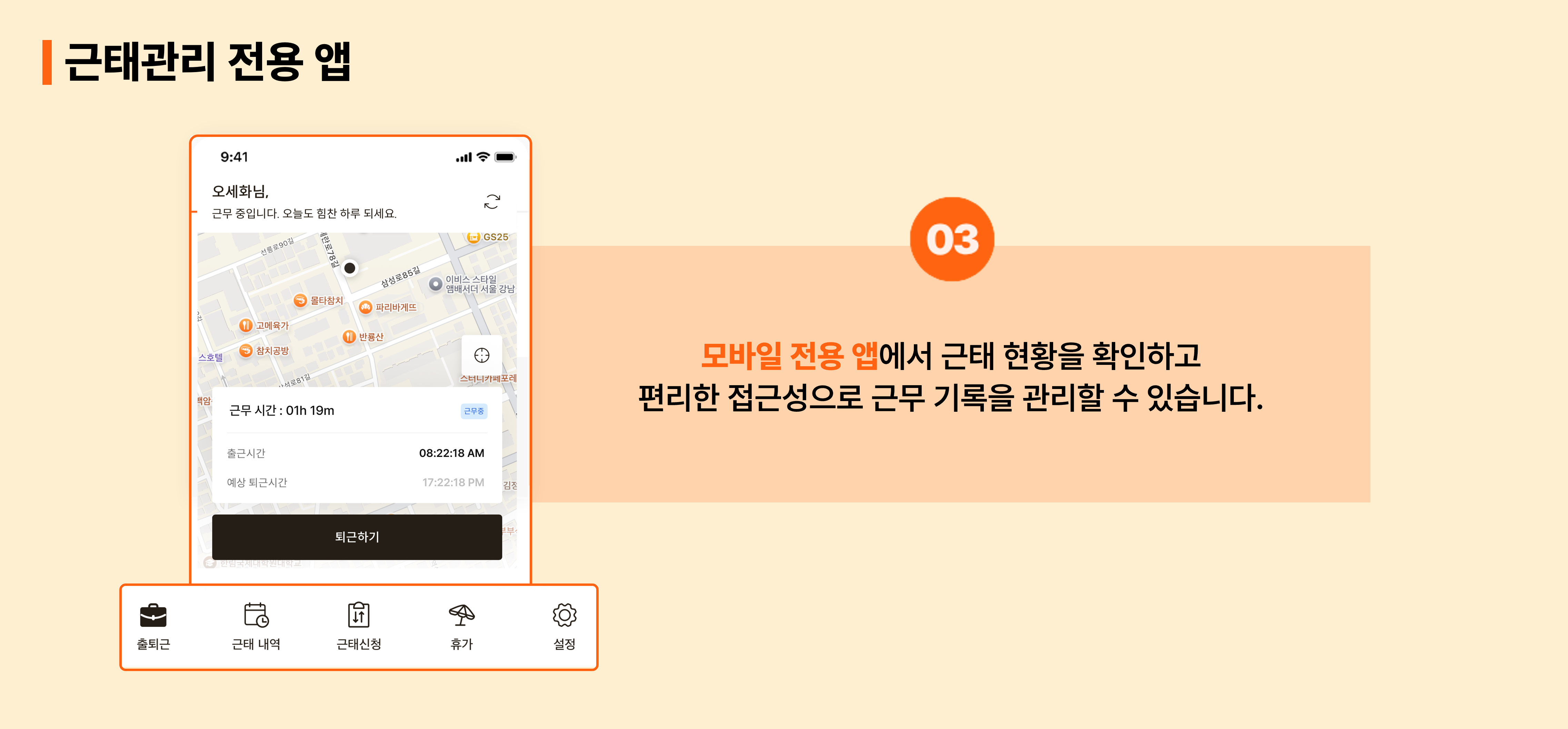 외부에서도 근태 관리의 편리함과 접근성을 유지할 수 있죠.