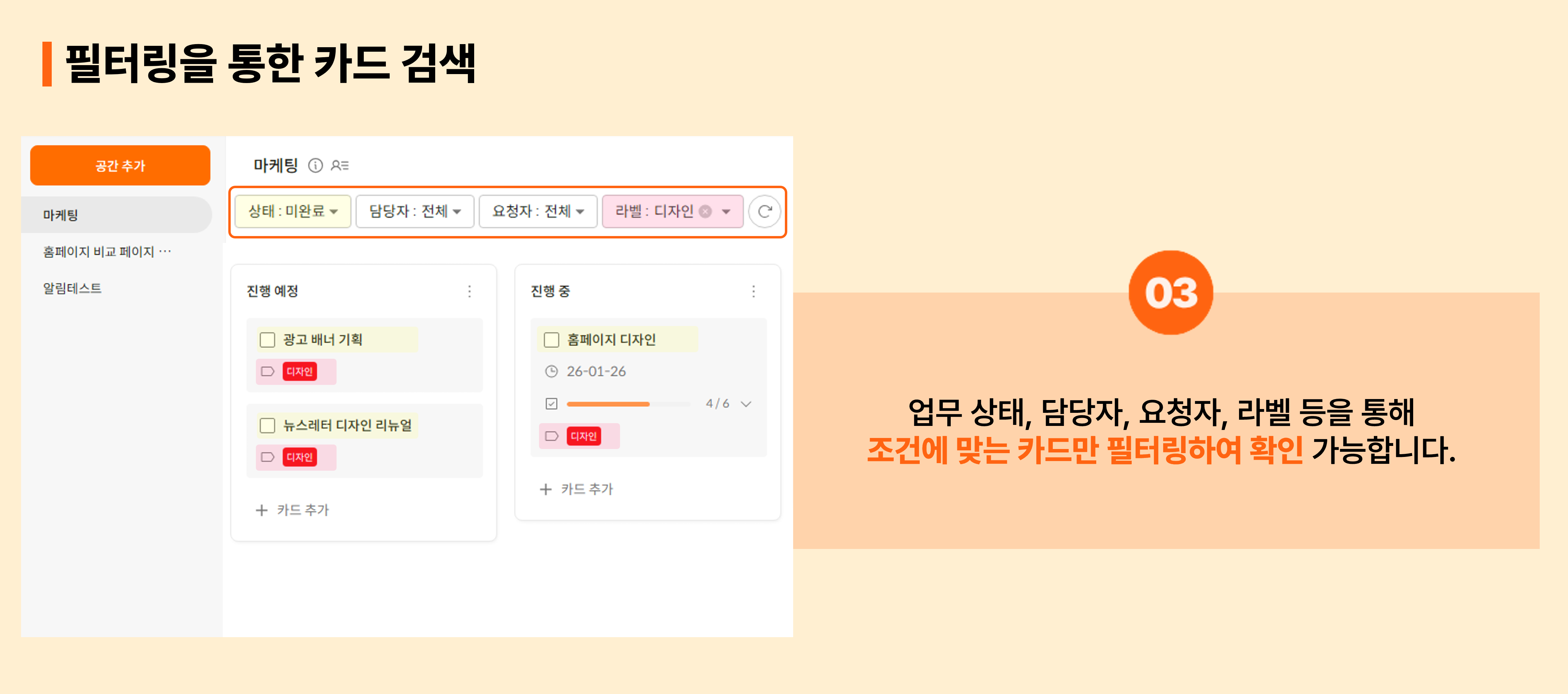 카드를 필터링해 필요한 업무를 즉시 찾아볼 수 있는데요.