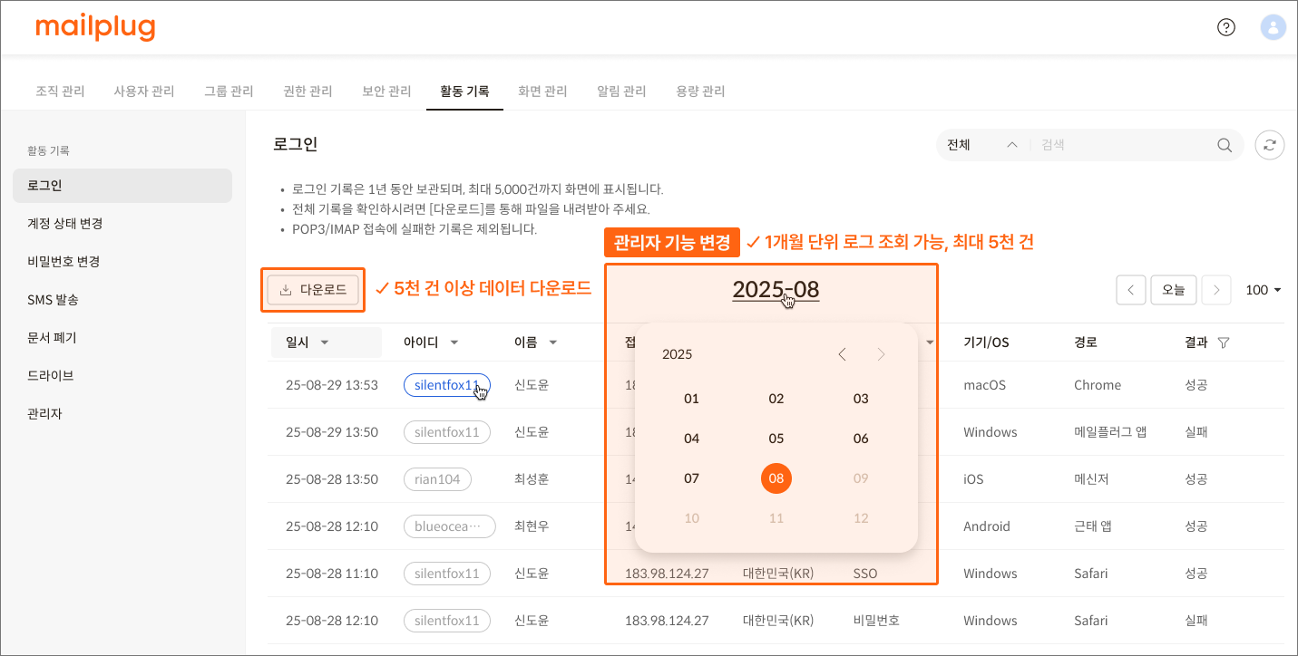 변경 : 로그 기록 1개월 단위, 최대 5천 건까지 확인 가능 / 5천 건 이상 데이터 파일 다운로드