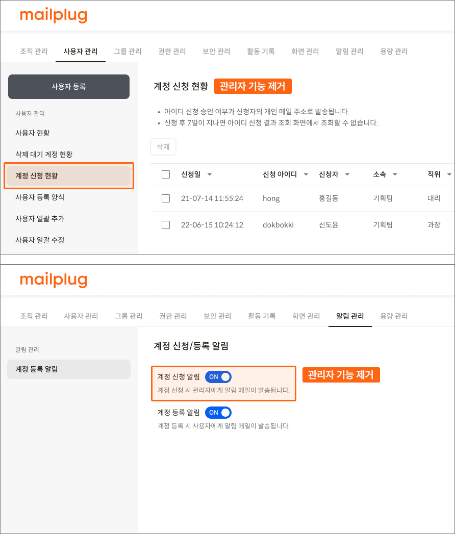 사용자 관리 > 계정 신청 현황 메뉴, 알림 관리 > 계정 신청 알림 기능도 함께 사라지게 됩니다.