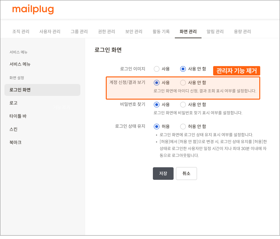 관리자 화면에서 제공하던 로그인 화면 > 계정 신청 / 결과보기 설정과