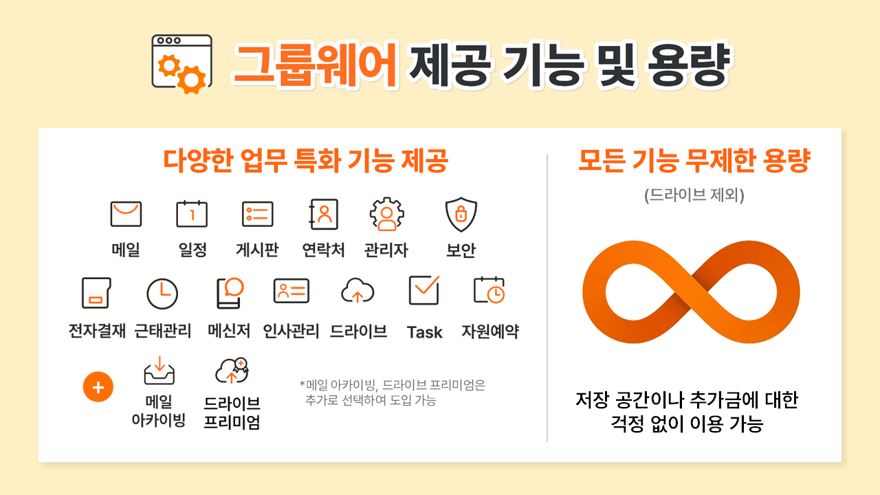 앞서 말씀드렸듯이 무제한 용량 그룹웨어를 제공하고 잇어
