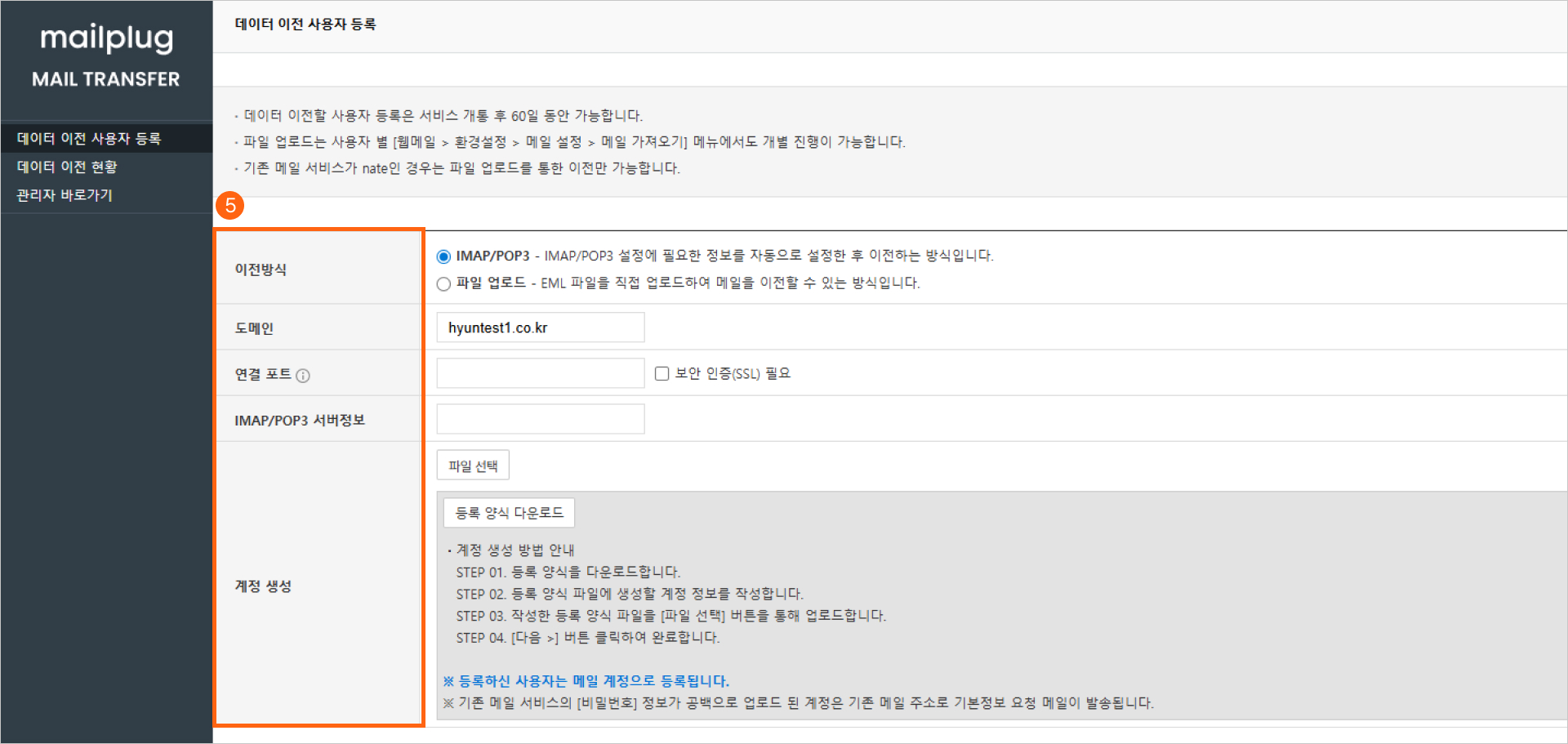 1) 메일플러그 서비스를 정상적으로 개통한 뒤에 이전 가능