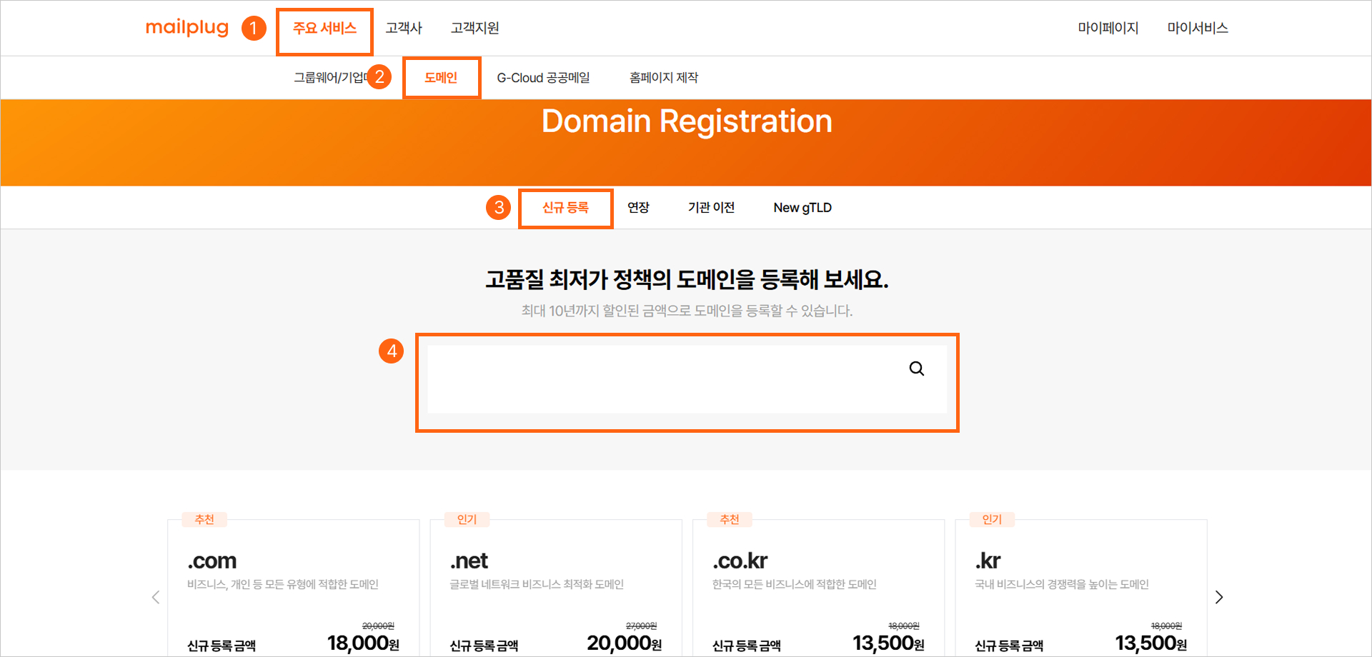 메일플러그 주요 서비스 > 도메인 > 신규 등록 메뉴에서 원하는 도메인을 검색해 구매해주세요.