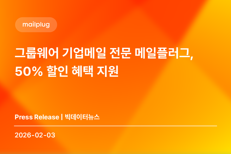 | [아시아투데이] 메일플러그 기업메일, 그룹웨어 50% 할인 프로모션 (0) | 2026.02.04 |