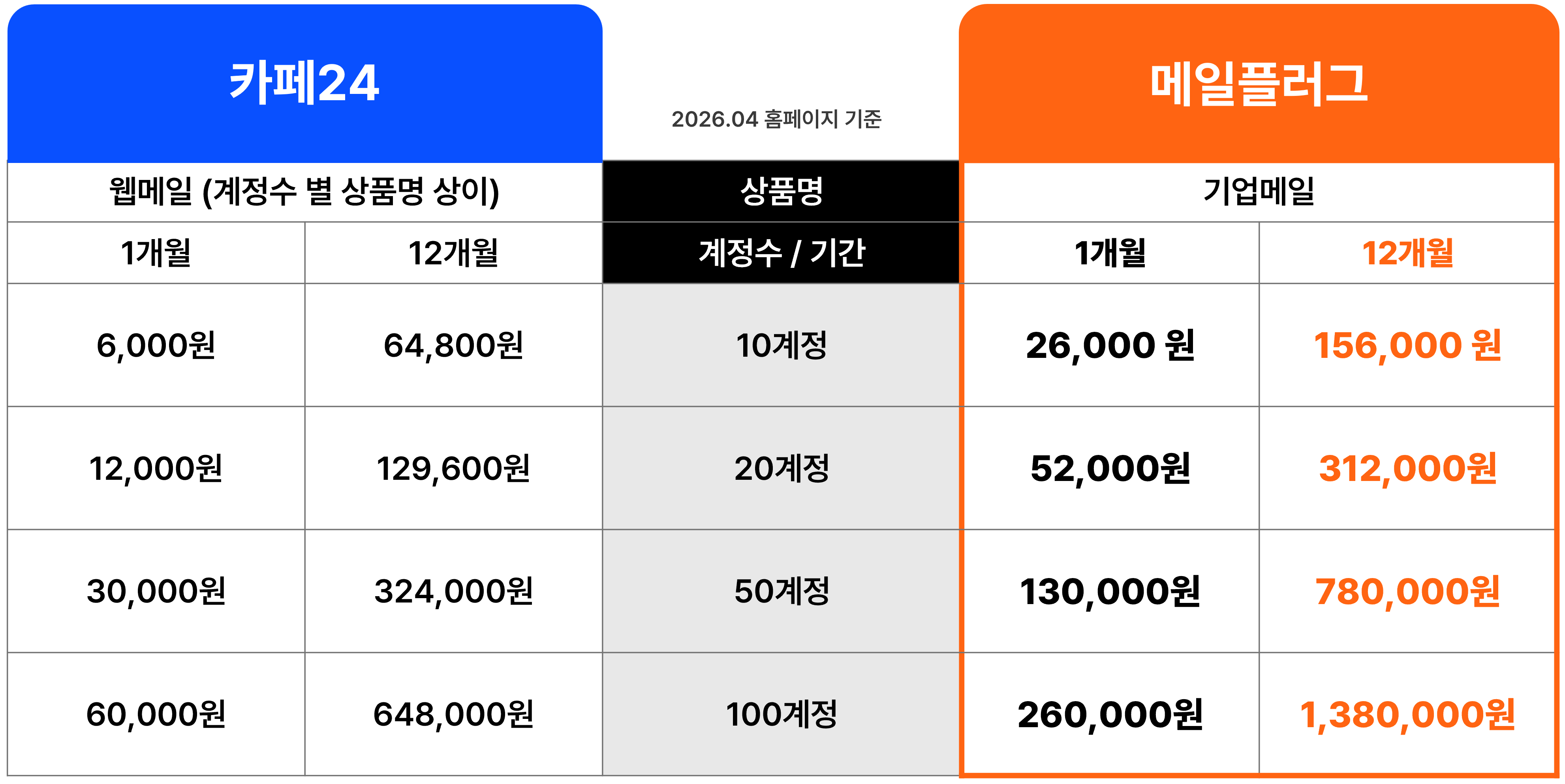 카페24와 메일플러그의 기업메일을 비교해보려고 하는데요.