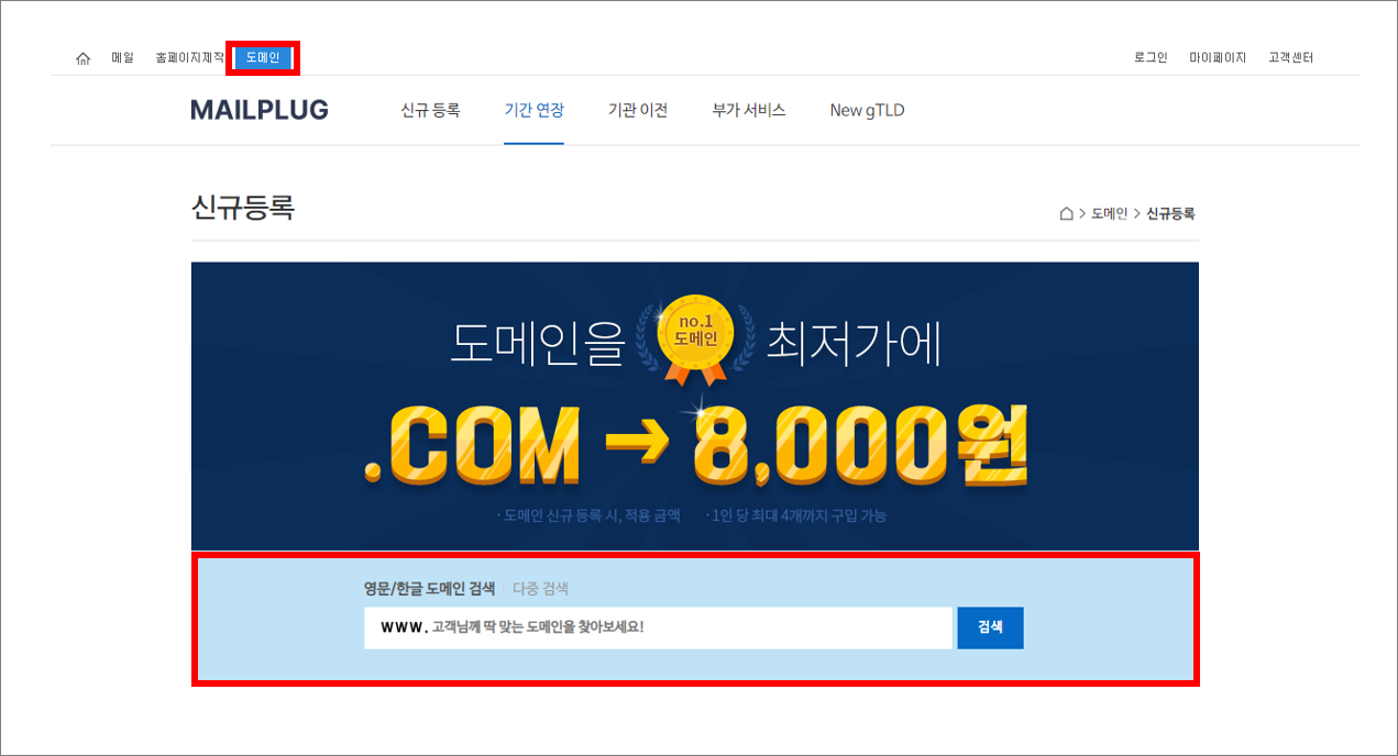 STEP 01 메일플러그 홈페이지 상단 [도메인]을 클릭 후, 조회하려는 도메인을 검색해주세요.
