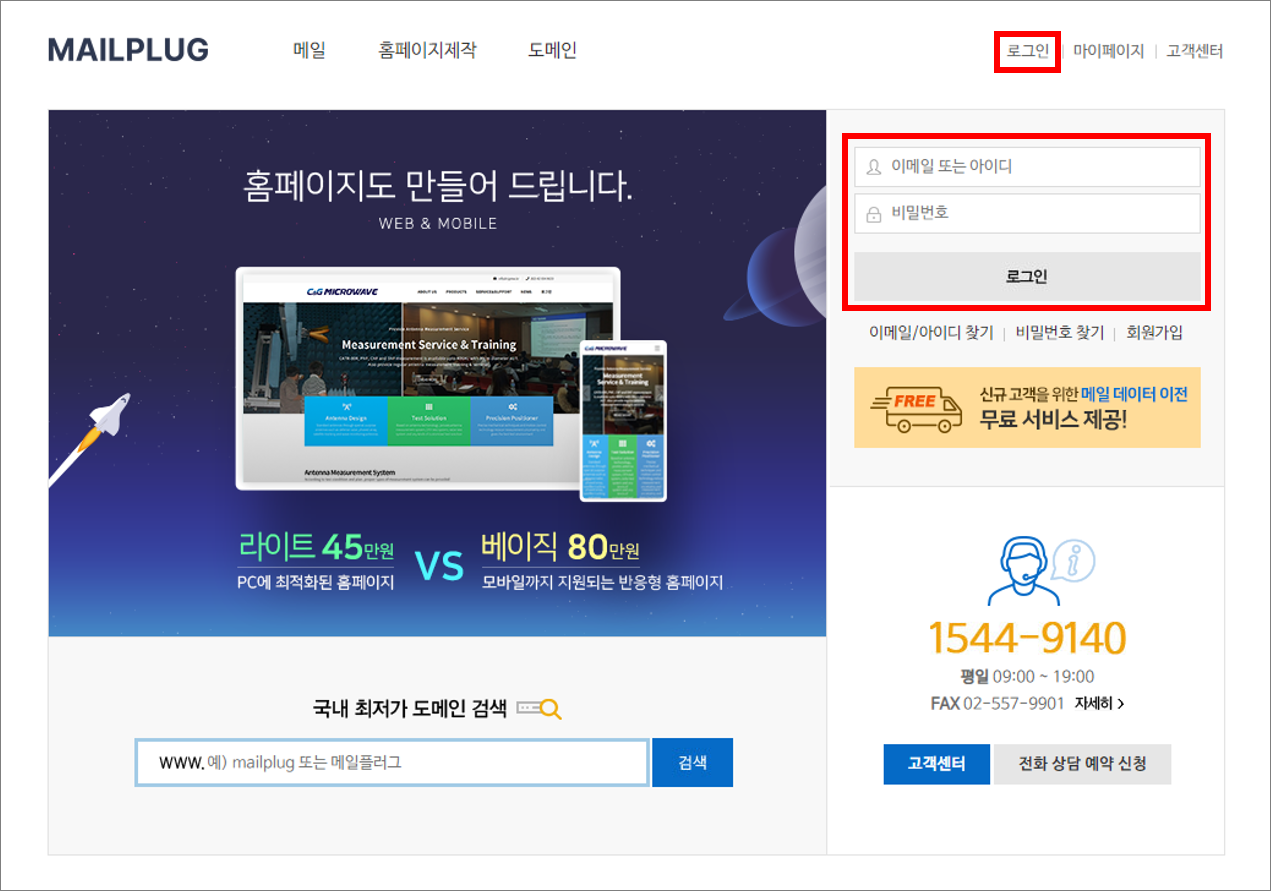 STEP 01 메일플러그 홈페이지 메인화면 상단