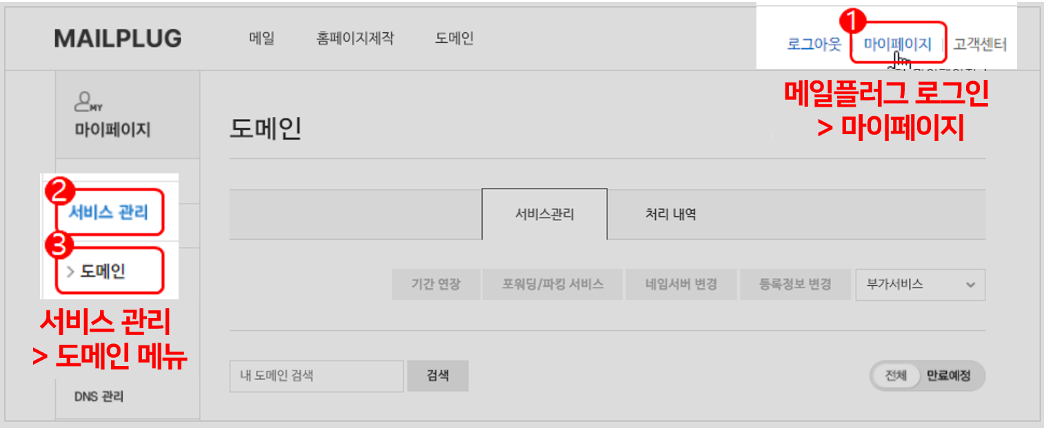 서비스 관리 메뉴에서 도메인을 선택해주세요.