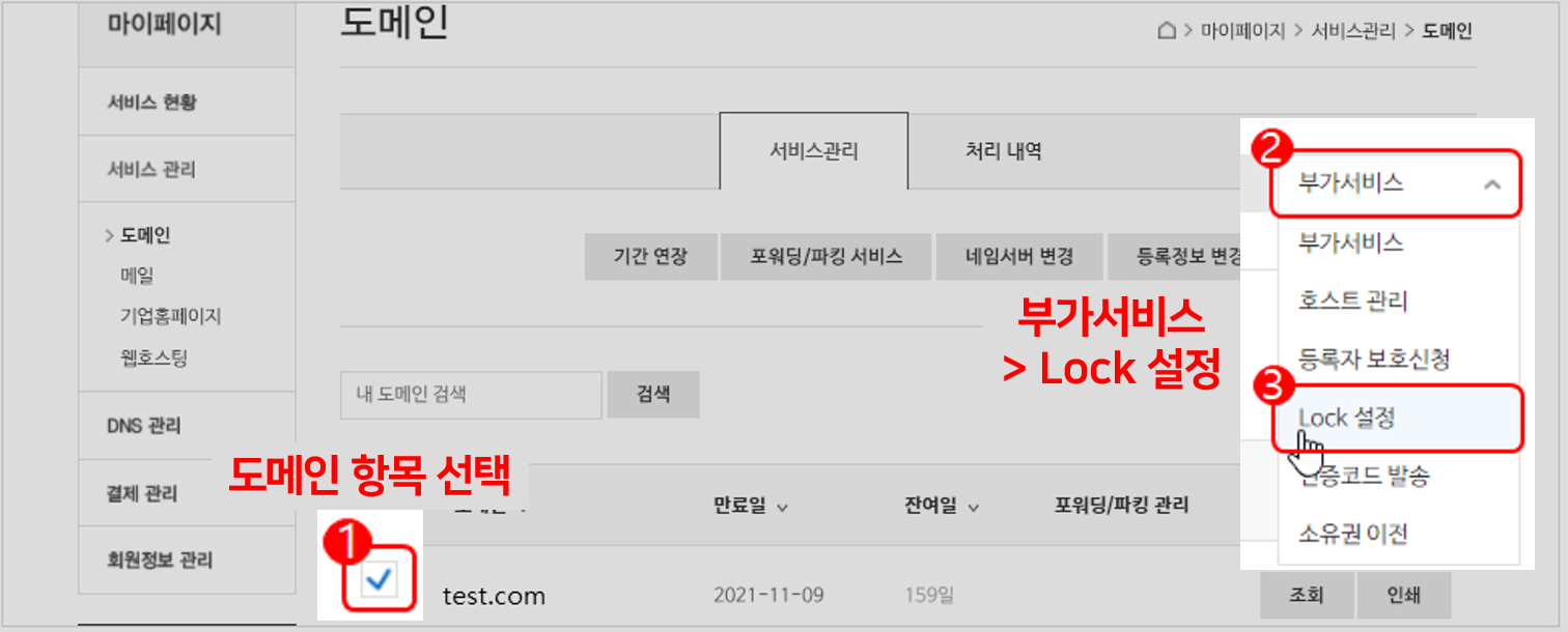 위 페이지에서 도메인 LOCK 설정 혹은 해제를 선택하실 수 있습니다.